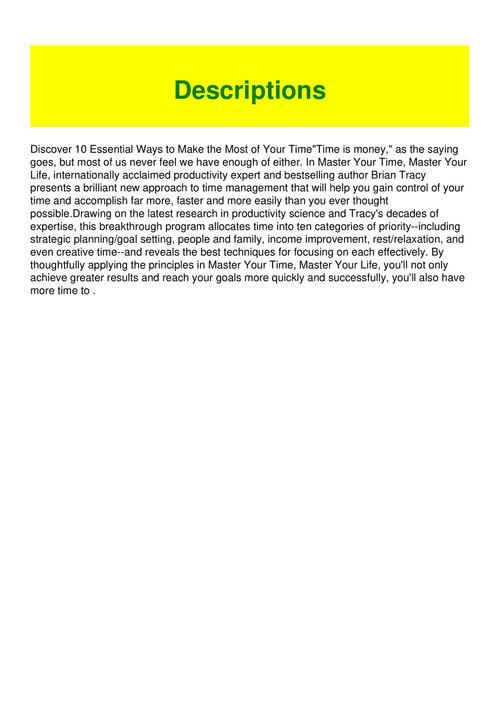 In master your time master your life internationally acclaimed productivity expert and bestselling author brian tracy presents a brilliant new approach to time management that will help you gain control of your time and accomplish far more faster and more easily than you ever thought possible. The breakthrough system to get more results faster in every area of your life book online at best prices in india on amazonin.